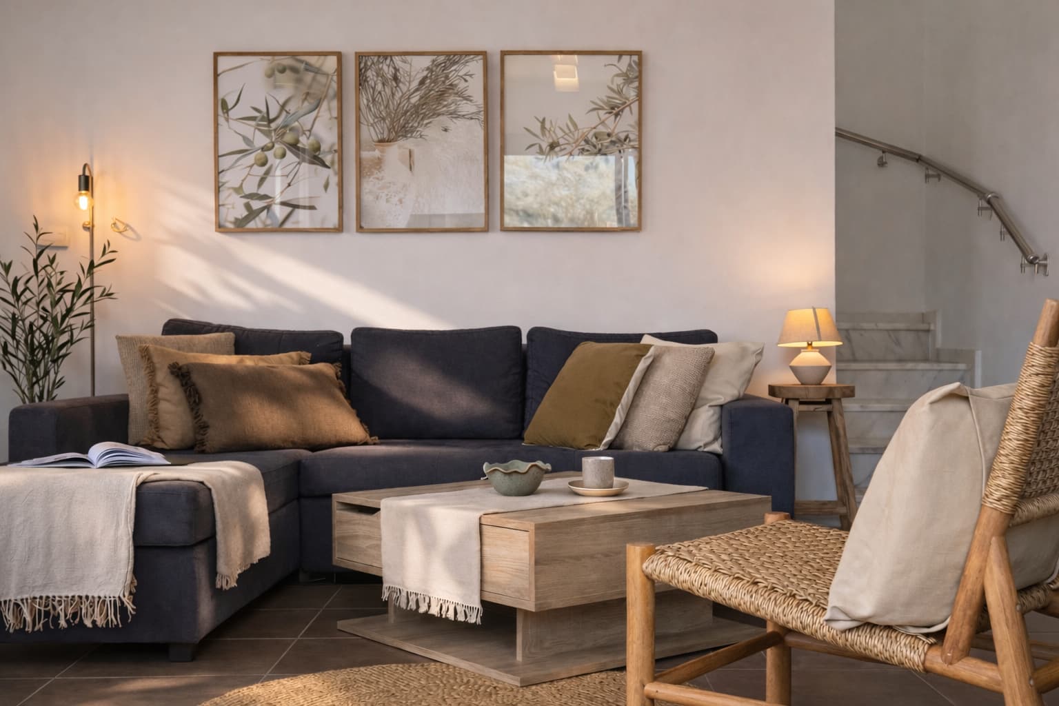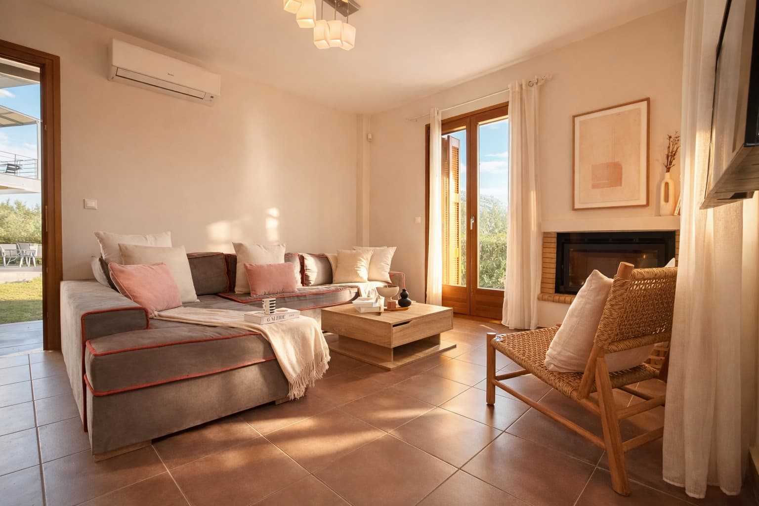 Lumière douce, matières naturelles et atmosphère apaisante — une villa pensée pour vivre au rythme des oliviers, avec une vue dégagée sur la mer et les montagnes.