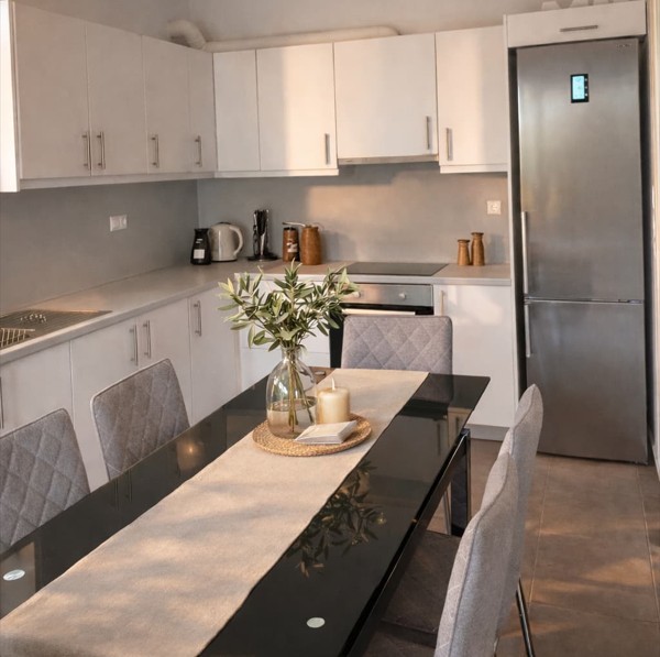 Designed across two levels, it offers a natural balance between privacy and shared living. Upstairs, two bedrooms with private balconies and a bathroom create a quiet retreat, while downstairs a fully equipped kitchen and a relaxed living area with a sofa bed, along with an additional WC, invite you to settle in with ease.