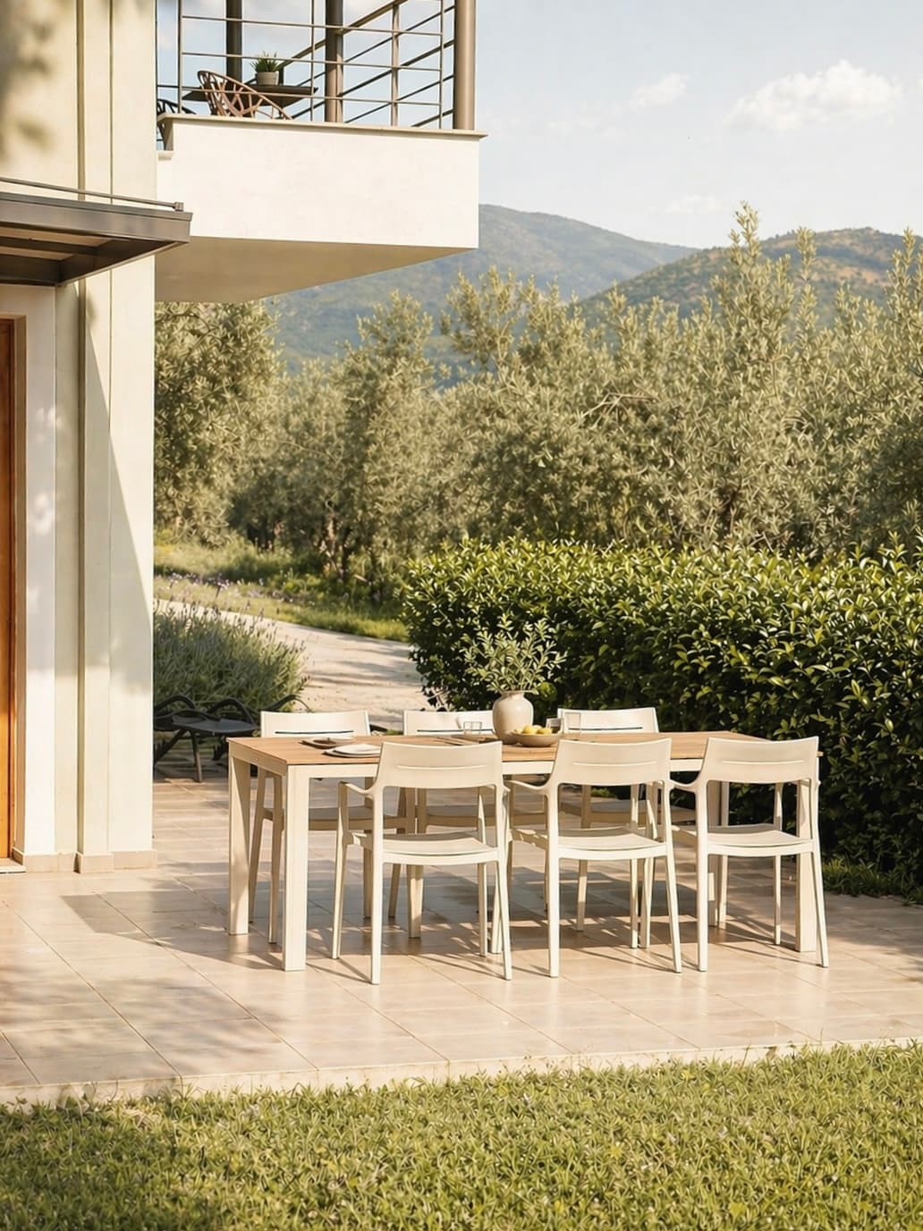 Outdoors, a private terrace with dining space extends the experience, allowing moments of connection throughout the day.