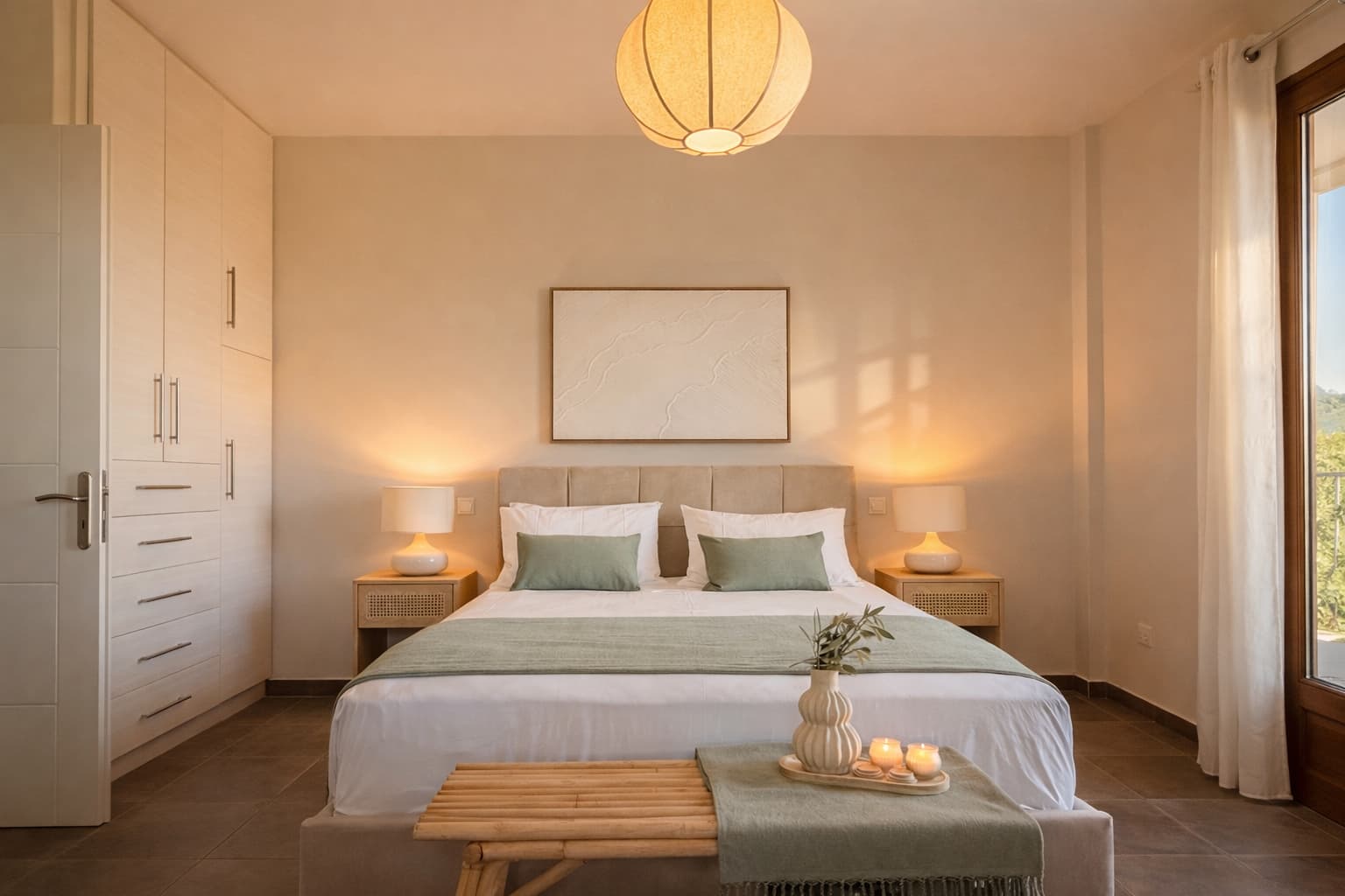 Lumière tamisée, textures naturelles et équilibre subtil — une villa conçue pour ceux qui cherchent à ralentir vraiment. Entourée de nature, elle s'ouvre sur la mer et les montagnes.